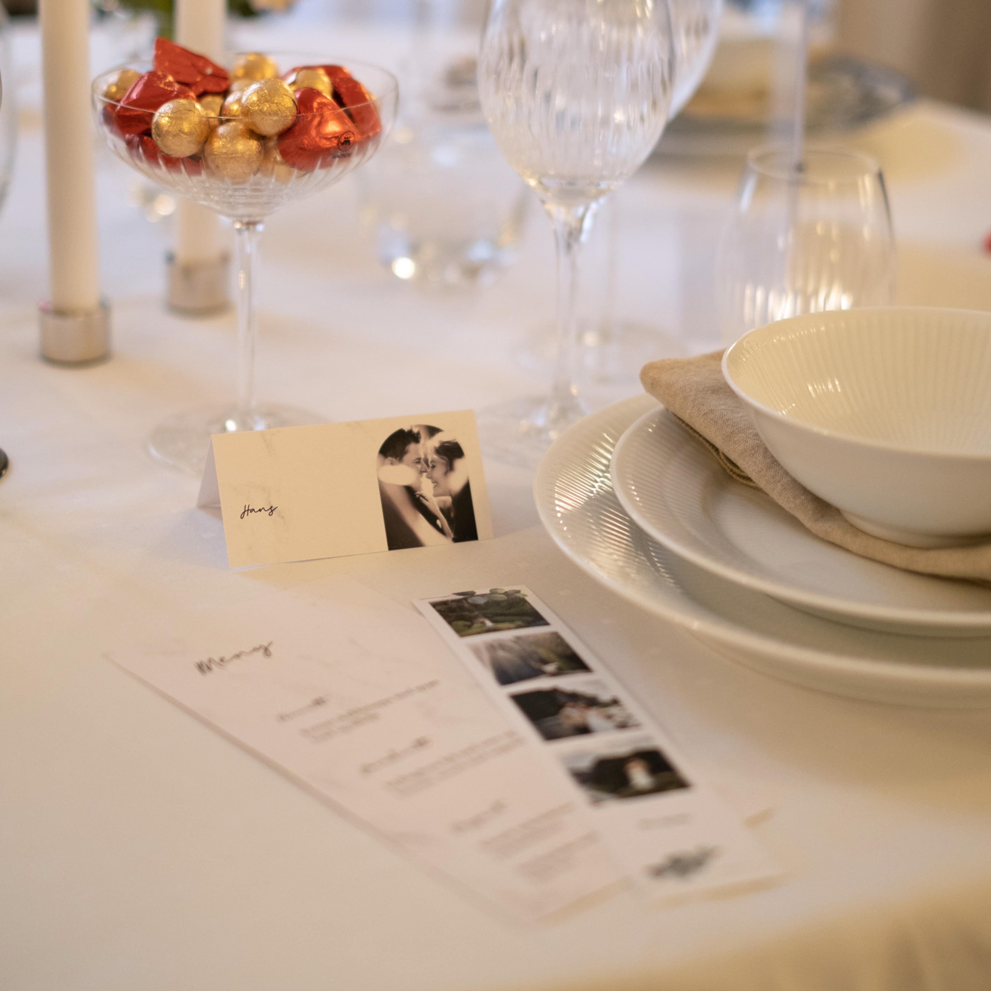 Bruk retro polaroidbilder i små holdere som en morsom og minneverdig vri på borddekkingen. Dette fungerer både som bordpynt og en hyggelig suvenir for gjestene. Passer perfekt som både pynt og personlig detalj!
